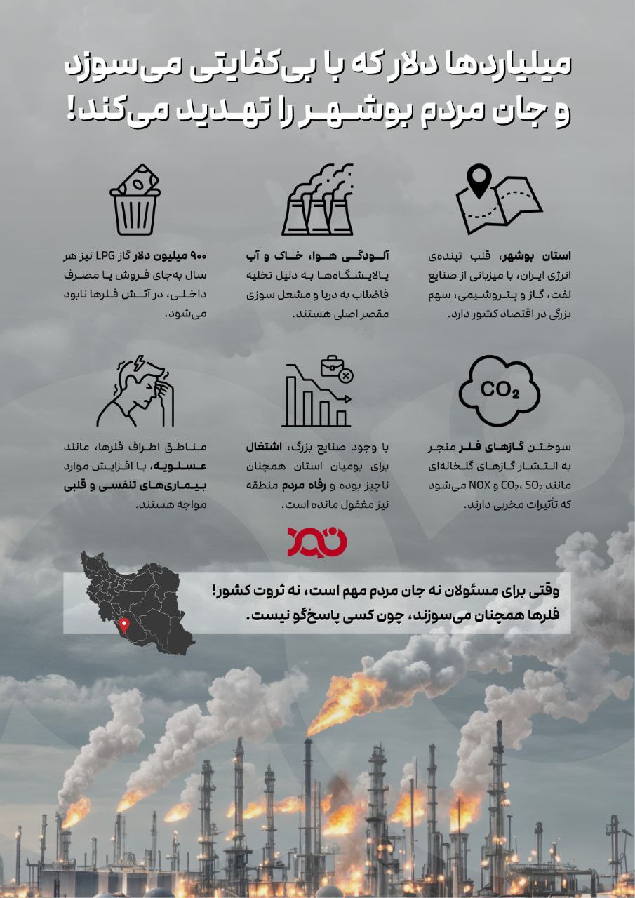 به گزارش صفحه انرژی؛ بوشهر، قلب تپندهی انرژی ایران، میزبان پالایشگاهها و صنایع پتروشیمی عظیمی است. اما فلرها، مشعلهای دائماً روشن این صنایع، به جای بهرهبرداری از گازهای همراه، آنها را میسوزانند و دودش را به ریهی مردم میفرستند.